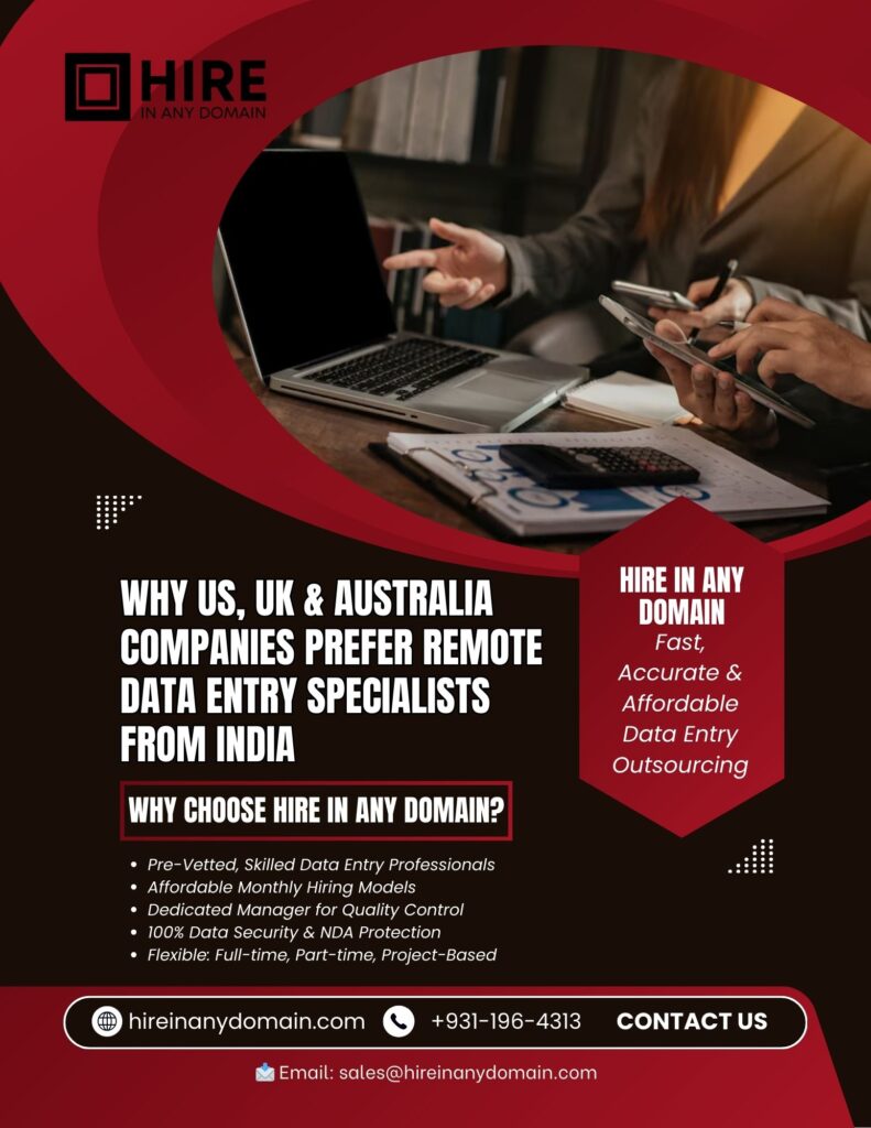 Outsourcing your bookkeeping needs to India has emerged as a practical solution for businesses worldwide. At Hire In Any Domain, we provide professional services to Hire BookKeeper India, backed by skilled Data Entry Specialists and comprehensive Accounting Services from India.